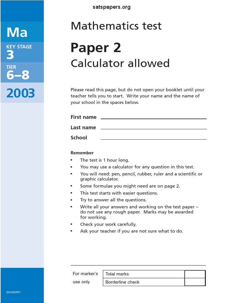 Mathematics Key Stage 3 Year 8 optional SATs papers - level 4-6 2011. Maths KS3 SATs - 2003 - 2009. Write all your answers and working on the test paper do not use any rough paper.